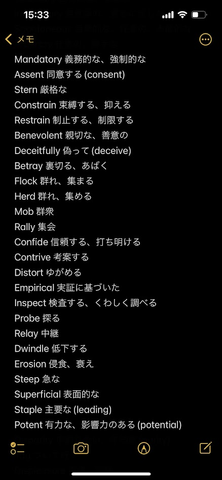 覚えていないor不安な単語とその意味をスマホのメモ機能に入力していく。ポイントは、紙ではなくデジタルで作っておくことです。そうすることで、後で追加や編集もしやすく、後に覚えた単語を削除していくことでより周回の効率を高めることも可能になります。